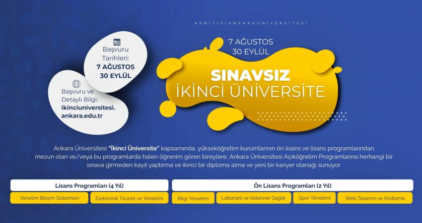 Ankara Üniversitesi “İkinci Üniversite” kapsamında, yüksekögretim kurumlarının ön lisans ve lisans programlarından mezun olan ve/veya bu programlarda öğrenim gören bireylere, Ankara Üniversitesi Açıköğretim Programlarına herhangi […]